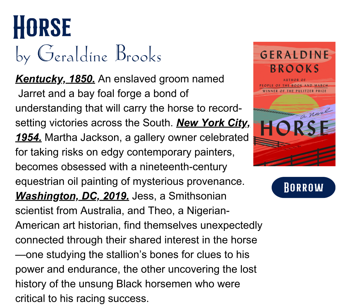 A discarded painting in a junk pile, a skeleton in an attic, and the greatest racehorse in American history: from these strands, a Pulitzer Prize winner braids a sweeping story of spirit, obsession, and injustice across American history. Based on the remarkable true story of the record breaking thoroughbred Lexington, Horse is a novel of art and science, love and obsession, and our unfinished reckoning with racism.